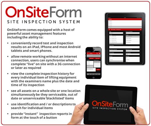 When we show clients how OnSiteForm works they can immediately grasp the simplicity and power of its use on tablets and smart phones. Then they see past that and come to appreciate the benefits of having a system which provides an early warning that flags up when lifting tackle is due for inspection, a safer colour coded process that means that equipment is not put into service accidentally and an aid to planned refurbishment and replacement.